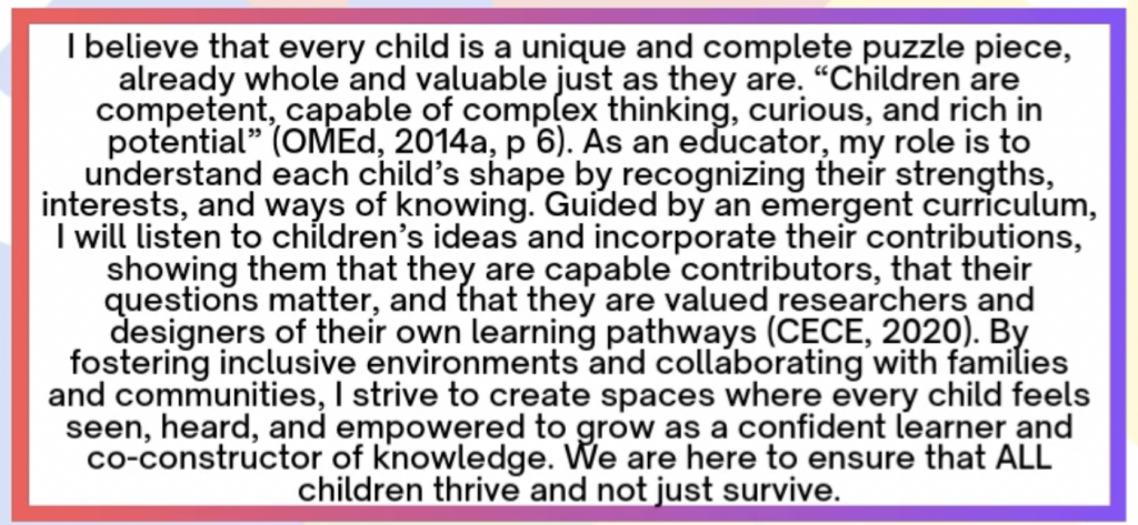 I believe that every child is a unique and complete individual, full of potential, curiosity, and capability. Grounded in *How Does Learning Happen?* (OME, 2014), I see children as competent learners who are rich in ideas and capable of complex thinking. In my practice, I strive to understand each child through careful observation, active listening, and intentional engagement. By recognizing their strengths, interests, and ways of knowing, I can create responsive learning experiences that reflect who they are. Rather than directing learning, I aim to co-construct knowledge alongside children, supporting them as active participants and capable contributors in their own learning journey. This approach demonstrates my understanding of the importance of shifting from a teacher-directed model to a child-centred and inquiry-based practice. Families play a vital role in children’s learning and development, and I recognize them as essential partners in the educational process. Families bring valuable insight into their children’s identities, cultures, and lived experiences, which helps educators develop a more holistic understanding of each child. In my practice, I am committed to building strong, respectful relationships with families through open and ongoing communication. I strive to create opportunities for families to feel heard, valued, and actively involved in their child’s learning. This is especially important when supporting neurodiverse children, as collaboration ensures that learning approaches are consistent, inclusive, and responsive to each child’s needs. By working in partnership with families, I aim to foster trust, strengthen connections, and create a supportive learning environment.